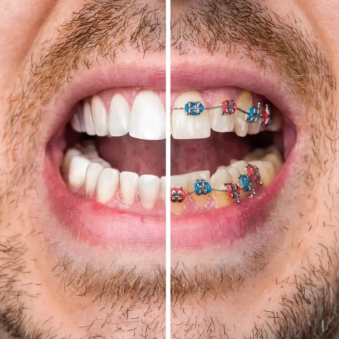 Metal braces: Harder to brush and floss around brackets. Food particles get trapped. Requires special flossing tools (water flossers or threaders). Takes longer to clean properly.
